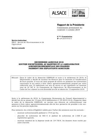 Dans le cadre de la démarche GERPLAN et suite à la sécheresse de 2018, le Département a décidé de soutenir les éleveurs pour le maintien et l’amélioration de leurs prairies. Il vous est ainsi proposé de mettre en paiement les subventions concernant le sur semis à forte valeur agroenvironnementale proposé par notre collectivité que 19 exploitants ont mis en œuvre et qui représente un montant total de 34 367 €. La Commission de l’Agriculture, de l’Environnement et du Cadre de Vie a donné un avis favorable lors de sa séance du 13 septembre 2019.