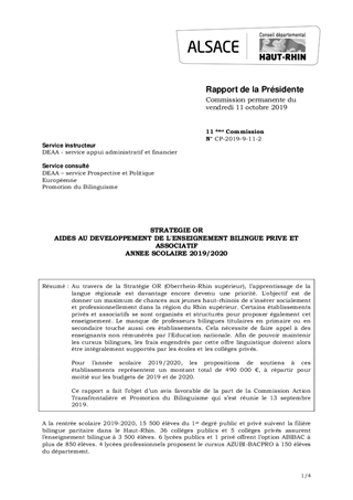 Au travers de la Stratégie OR (Oberrhein-Rhin supérieur), l’apprentissage de la langue régionale est davantage encore devenu une priorité. L'objectif est de donner un maximum de chances aux jeunes haut-rhinois de s'insérer socialement et professionnellement dans la région du Rhin supérieur. Certains établissements privés et associatifs se sont organisés et structurés pour proposer également cet enseignement. Le manque de professeurs bilingues titulaires en primaire ou en secondaire touche aussi ces établissements. Cela nécessite de faire appel à des enseignants non rémunérés par l'Education nationale. Afin de pouvoir maintenir les cursus bilingues, les frais engendrés par cette offre linguistique doivent alors être intégralement supportés par les écoles et les collèges privés. Pour l’année scolaire 2019/2020, les propositions de soutiens à ces établissements représentent un montant total de 490 000 €, à répartir pour moitié sur les budgets de 2019 et de 2020. Ce rapport a fait l’objet d’un avis favorable de la part de la Commission Action Transfrontalière et Promotion du Bilinguisme qui s’est réunie le 13 septembre 2019.