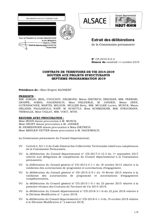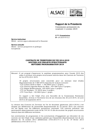Il est proposé d’approuver la septième programmation pour l’année 2019 des aides à attribuer aux projets structurants inscrits dans les Contrats de Territoire de Vie (CTV) 2014 2019. 18 projets structurants sont concernés pour un montant total d’aides départementales de 3 085 644 € réparties de la façon suivante : - CTV Colmar Fecht et Ried : 1 784 800 € pour 7 projets ; - CTV Florival Vignoble Plaine du Rhin : 454 496 € pour 5 projets ; - CTV Région Mulhousienne : 624 848 € pour 3 projets ; - CTV du Sundgau : 91 500 € pour 2 projets ; - CTV Trois Pays : 130 000 € pour 1 projet. Ce rapport a fait l’objet d’un avis favorable de la Commission Patrimoine Immobilier, Actions et Territoires lors de ses réunions des 26 avril 2019, 22 août 2019 et 20 septembre 2019.