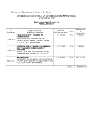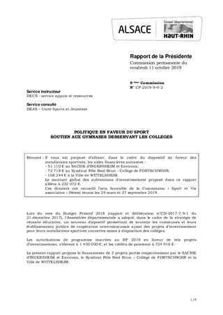Il vous est proposé d’allouer, dans le cadre du dispositif en faveur des installations sportives, les aides financières suivantes : - 51 110 € au SACSIE d’INGERSHEIM et Environs, - 72 718 € au Syndicat Pôle Ried Brun - Collège de FORTSCHWIHR, - 108 244 € à la Ville de WITTELSHEIM. Le montant global des subventions d'investissement proposé dans ce rapport s’élève à 232 072 €. Ces dossiers ont recueilli l’avis favorable de la Commission « Sport et Vie associative » (9ème) réunie les 29 mars et 27 septembre 2019.