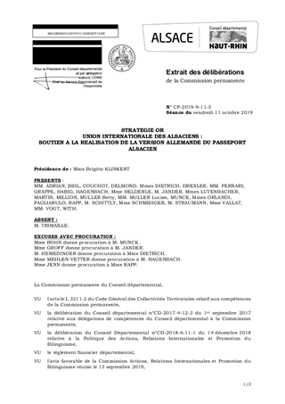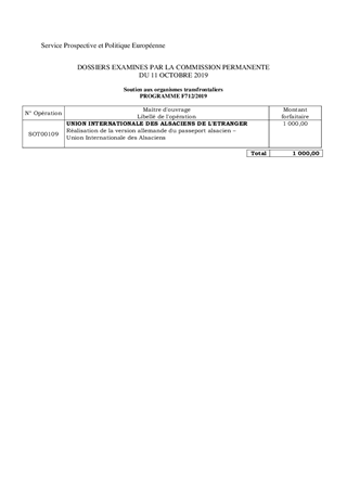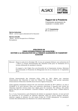 Dans le cadre de la Stratégie OR, il vous est proposé d’allouer une subvention de 1 000 € à l’Union Internationale des Alsaciens (UIA) pour la réalisation de la version allemande du passeport alsacien. Ce rapport a fait l’objet d’un avis favorable de la Commission Actions, Relations Internationales et Promotion du Bilinguisme lors de sa réunion du 13 septembre 2019.