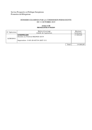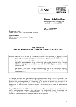 Depuis 2004, la Ville de Guebwiller organise chaque année un festival culturel pour la promotion de la langue et de la culture régionale intitulé BILINGO. Le Département du Haut-Rhin avait encouragé et soutenu sa création dans le cadre du développement et de l'attractivité des cursus bilingues. Pour l'édition 2019, il est proposé de reconduire une aide de 14 000 € pour le soutien à cette manifestation. Ce rapport a fait l’objet d’un avis favorable de la part de la Commission Actions, Relations Internationales et Promotion du Bilinguisme qui s’est réunie le 13 septembre 2019.