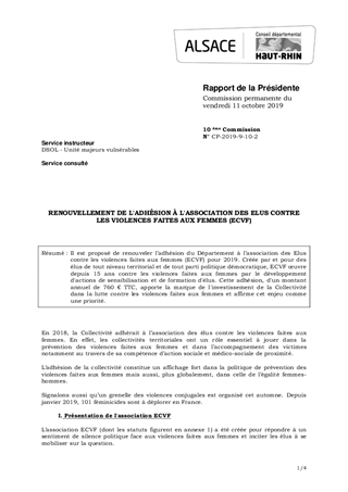Il est proposé de renouveler l’adhésion du Département à l’association des Elus contre les violences faites aux femmes (ECVF) pour 2019. Créée par et pour des élus de tout niveau territorial et de tout parti politique démocratique, ECVF œuvre depuis 15 ans contre les violences faites aux femmes par le développement d'actions de sensibilisation et de formation d'élus. Cette adhésion, d'un montant annuel de 760 € TTC, apporte la marque de l'investissement de la Collectivité dans la lutte contre les violences faites aux femmes et affirme cet enjeu comme une priorité.