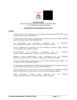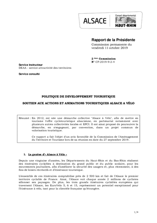 En 2012, est née une démarche collective "Alsace à Vélo", afin de mettre en tourisme l'offre cyclotouristique alsacienne, en partenariat notamment avec plusieurs autres collectivités locales et EPCI. Il est ainsi proposé de poursuivre la démarche, en s'engageant, par convention, dans un projet commun de valorisation touristique. Ce rapport a fait l'objet d'un avis favorable de la Commission de l'Aménagement du Territoire et Tourisme lors de sa réunion en date du 27 septembre 2019.