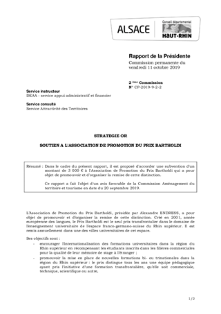 Dans le cadre du présent rapport, il est proposé d'accorder une subvention d'un montant de 3 000 € à l'Association de Promotion du Prix Bartholdi qui a pour objet de promouvoir et d'organiser la remise de cette distinction. Ce rapport a fait l'objet d'un avis favorable de la Commission Aménagement du territoire et tourisme en date du 20 septembre 2019.