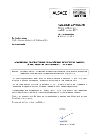 Le présent rapport présente en annexe le procès-verbal de la réunion publique de l'Assemblée départementale qui s'est tenue le vendredi 21 juin 2019.