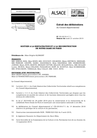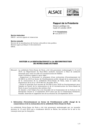 La cathédrale Notre-Dame de Paris a été très gravement endommagée le 15 avril 2019. Le Département du Haut-Rhin souhaite s’associer à l’élan de solidarité nationale pour venir en aide à la reconstruction de l’édifice. Aussi, le présent rapport a pour objet : - d’approuver et d’autoriser le versement d’une subvention d’investissement de 50 000 € en 2019 en faveur de l’établissement public chargé de la conservation et de la restauration de la cathédrale Notre-Dame de Paris, dans le cadre des dispositions de la loi n° 2019-803 du 29 juillet 2019, - d’acter le principe d’un soutien de 50 000 € pour 2020 en fonctionnement pour l’emploi en faveur de la restauration et de la reconstruction de Notre-Dame de Paris et pour la promotion des métiers d’art. Ce dossier a fait l’objet d’un avis favorable de la Commission de la Culture et du Patrimoine réunie le 13 septembre 2019 ainsi que de la Commission Solidarité, Famille, Insertion et Logement lors de sa réunion du 20 septembre 2019.