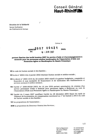 portant fixation des tarifs horaires 2007 du service d'aide et d'accompagnement à domicile pour les personnes adultes handicapées de l'association d'aide aux personnes âgées ou handicapées du Bassin Potassique. Resumé Pièces jointes ARRETE Assemblée : Non défini Date : 04/06/2007 Rapporteur : Non défini Collectivité : Conseil départemental du Haut-Rhin Direction : Non défini Service : Service de la Tarification des Etablissements Domaine : Personnes Agées Commission :