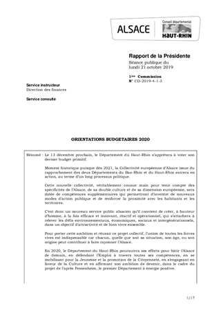 Le 13 décembre prochain, le Département du Haut-Rhin s’apprêtera à voter son dernier budget primitif. Moment historique puisque dès 2021, la Collectivité européenne d’Alsace issue du rapprochement des deux Départements du Bas-Rhin et du Haut-Rhin entrera en action, au terme d’un long processus politique. Cette nouvelle collectivité, véritablement cousue main pour tenir compte des spécificités de l’Alsace, de sa double culture et de sa dimension européenne, sera dotée de compétences supplémentaires qui permettront d’inventer de nouveaux modes d’action publique et de renforcer la proximité avec les habitants et les territoires. C’est donc un nouveau service public alsacien qu’il convient de créer, à hauteur d’homme, à la fois efficace et innovant, réactif et opérationnel, qui s’attachera à relever les défis environnementaux, économiques, sociaux et intergénérationnels, dans un objectif d’attractivité et de bien vivre ensemble. Pour porter cette ambition et réussir ce projet collectif, l’union de toutes les forces vives est indispensable car chacun, quelle que soit sa situation, son âge, ou son origine peut contribuer à faire rayonner l’Alsace. En 2020, le Département du Haut-Rhin poursuivra ses efforts pour bâtir l’Alsace de demain, en défendant l’Emploi à travers toutes ses compétences, en se mobilisant pour la Jeunesse et la promotion de la Citoyenneté, en s’engageant en faveur de la Culture et en affirmant son ambition de devenir, dans le cadre du projet de l’après Fessenheim, le premier Département à énergie positive. Le Département tiendra ses engagements et renforcera ses politiques en consacrant un montant qui devrait atteindre 120 M€ d’investissement opérationnel sur des actions de proximité qui impacteront directement le quotidien des Hauts-Rhinois. Ce haut niveau d’investissement est le résultat d’une volonté politique forte de mettre à profit les économies de gestion réalisées depuis le début de la mandature pour accélérer le Plan de Réussite Educative pour Tous (PRET), intensifier les politiques de retour vers l’activité, à l’instar de l’opération rSa et Vendanges, répondre présent aux besoins de la protection de l’enfance, renforcer la préservation du patrimoine alsacien avec le Plan Patrimoine 68 et concrétiser les projets d’aménagement stratégiques nécessaires au développement de notre territoire. En 2020 plus que jamais, nos choix doivent nous rapprocher, nous inviter à faire l’union, à s’engager résolument dans la proximité et la recherche permanente de l’efficience de nos politiques. Cette ambition pourra se réaliser en maintenant les indicateurs financiers de la collectivité au vert : maintien d’un bon niveau d’autofinancement, maîtrise de la dette, fiscalité au plus bas et optimisation des moyens de gestion dédiés à l’administration. Telle sera notre feuille de route pour l’élaboration du Budget Primitif 2020.