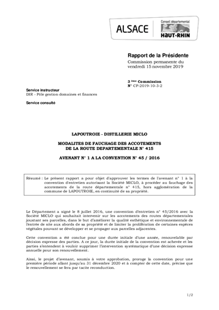 Le présent rapport a pour objet d'approuver les termes de l'avenant n° 1 à la convention d'entretien autorisant la Société MICLO, à procéder au fauchage des accotements de la route départementale n° 415, hors agglomération de la commune de LAPOUTROIE, en continuité de sa propriété.
