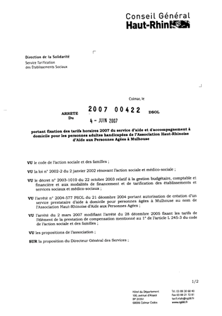 portant fixation des tarifs horaires 2007 du service d'aide et d'accompagnement à domicile pour les personnes adultes handicapées de l'association haut-rhinoise d'aide aux personnes âgées à MULHOUSE. Resumé Pièces jointes ARRETE Assemblée : Non défini Date : 04/06/2007 Rapporteur : Non défini Collectivité : Conseil départemental du Haut-Rhin Direction : Non défini Service : Service de la Tarification des Etablissements Domaine : Personnes Agées Commission :