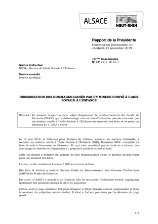 Le présent rapport a pour objet d'approuver le remboursement du Fonds de Garantie (SARVI) qui a dédommagé une victime d'infraction pénale commise par un mineur confié à l'Aide Sociale à l'Enfance au moment des faits et ce pour un montant de 1 300,46 euros.