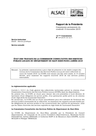 ÉTAT DES TRAVAUX DE LA COMMISSION CONSULTATIVE DES SERVICESPUBLICS LOCAUX DU DÉPARTEMENT DU HAUT-RHIN POUR L'ANNÉE 2019