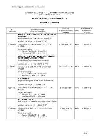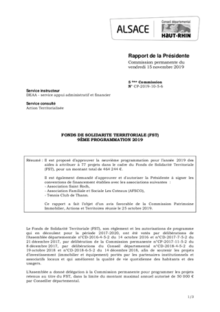 Il est proposé d’approuver la neuvième programmation pour l’année 2019 des aides à attribuer à 77 projets dans le cadre du Fonds de Solidarité Territoriale (FST), pour un montant total de 464 244 €. Il est également demandé d'approuver et d'autoriser la Présidente à signer les conventions de financement établies avec les associations suivantes : - Association Saint Roch, - Association Familiale et Sociale Les Coteaux (AFSCO), - Tennis Club de Thann. Ce rapport a fait l’objet d’un avis favorable de la Commission Patrimoine Immobilier, Actions et Territoires réunie le 25 octobre 2019.