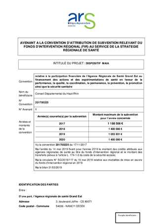 AVENANT A LA CONVENTION 2017-2019 ENTRE LE DEPARTEMENT ET L'AGENCE REGIONALE DE SANTE GRAND EST FIXANT LES MODALITES DE FINANCEMENT DES 5 MAIA