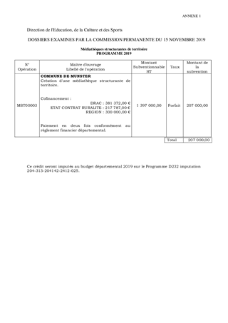 Le présent rapport propose d'attribuer et d'autoriser le versement d'une subvention d'investissement pour un montant total de 207 000 € en faveur de la Commune de Munster au titre de l'aide à la création d’une médiathèque structurante de territoire. Par ailleurs, il autorise la signature en 2019 et 2020 des avenants financiers au « Contrat Territoire Lecture » (CTL) 2018-2020, sur la base du modèle joint, pour la perception d’une subvention d’Etat. Le dossier a fait l'objet d'un avis favorable de la Commission de la Culture et du Patrimoine réunie le 13 septembre et le 25 octobre 2019.