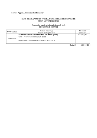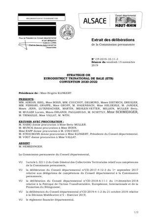 Il est proposé de valider le principe d’un cofinancement de l’Eurodistrict Trinational de Bâle (ETB) par le Département pendant la période 2020–2022, à hauteur de 22 670 € par an et de formaliser cet engagement dans la convention jointe en annexe. Ce rapport a fait l’objet d’un avis favorable de la Commission Actions, Relations Internationales et Promotion du Bilinguisme lors de sa réunion du 13 septembre 2019.