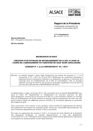 MICHELBACH-LE-HAUTCREATION D'UN OUVRAGE DE RETABLISSEMENT DE LA RD 16 DANS LE CADRE DE L'AMENAGEMENT DU PARCOURS DE GOLF SAINT-APOLLINAIREAVENANT N° 1 A LA CONVENTION N° 24 / 2017