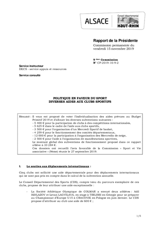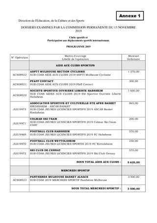 Il vous est proposé de voter l’individualisation des aides prévues au Budget Primitif 2019 et d’allouer les diverses subventions suivantes : - 5 400 € pour la participation de clubs à des compétitions internationales, - 5 625 € dans le cadre de l’aide aux clubs sportifs, - 3 500 € pour l’organisation d’un Mercredi Sportif de basket, - 4 259 € pour le fonctionnement des comités départementaux, - 12 000 € pour la participation à l’organisation des Mercredis de neige, - 2 500 € pour l’aide à l’organisation de manifestations sportives, Le montant global des subventions de fonctionnement proposé dans ce rapport s’élève à 33 284 €. Ces dossiers ont recueilli l’avis favorable de la Commission « Sport et Vie associative » (9ème) réunie le 27 septembre 2019.