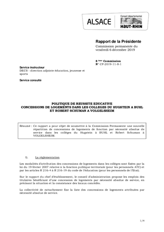 Ce rapport a pour objet de soumettre à la Commission Permanente une nouvelle répartition de concessions de logements de fonction par nécessité absolue de service dans les collèges du Hugstein à BUHL et Robert Schuman à VOLGELSHEIM.