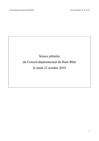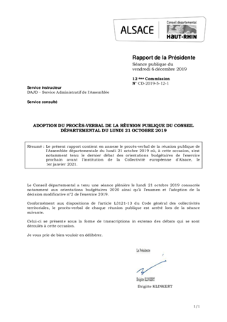 Le présent rapport contient en annexe le procès-verbal de la réunion publique de l'Assemblée départementale du lundi 21 octobre 2019 où, à cette occasion, s'est notamment tenu le dernier débat des orientations budgétaires de l'exercice prochain avant l'institution de la Collectivité européenne d'Alsace, le 1er janvier 2021.
