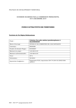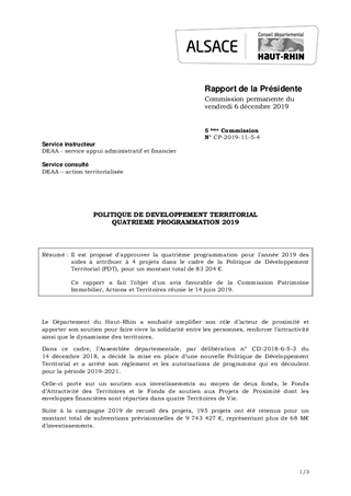 Il est proposé d'approuver la quatrième programmation pour l'année 2019 des aides à attribuer à 4 projets dans le cadre de la Politique de Développement Territorial (PDT), pour un montant total de 83 204 €. Ce rapport a fait l'objet d'un avis favorable de la Commission Patrimoine Immobilier, Actions et Territoires réunie le 14 juin 2019.