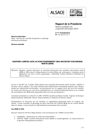 Rapport annuel décrivant la situation financière des sociétés d'économie mixte (SEM et SPL) dont le Département du Haut-Rhin est actionnaire. L'analyse porte également sur trois autres organismes : ADAUHR, Colmar Habitat et Habitats de Haute-Alsace.