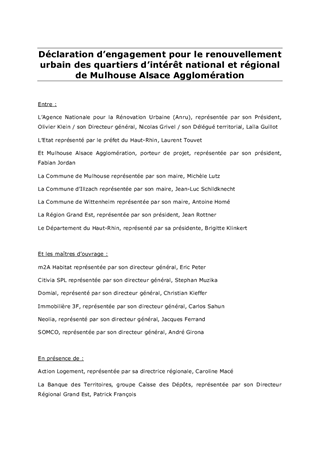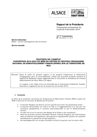 Dans le cadre du présent rapport, il est proposé d'approuver la déclaration d'engagement pour le renouvellement urbain des quartiers d'intérêt national et régional de Mulhouse Alsace Agglomération et d'autoriser la Présidente du Conseil départemental du Haut-Rhin à la signer. Ce rapport a fait l'objet d'un avis favorable de la Commission Solidarité, Famille, Insertion et Logement lors de sa réunion du 25 octobre 2019.