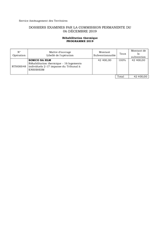 Dans le cadre de la politique départementale de l’habitat et de la convention 2017-2020 entre le Département du Haut Rhin, l’Eurométropole de Strasbourg, l’Association Régionale des organismes HLM d’ALSACE et la Caisse des Dépôts et Consignations (CDC), le Département soutient la réhabilitation thermique des logements du parc social. A ce titre, il vous est proposé d’accorder à la SOMCO une subvention départementale de 42 400 € pour la réhabilitation thermique de 16 logements individuels locatifs sociaux situés 2 à 17 impasse du Tribunal à ENSISHEIM. Il est proposé d’établir une convention fixant notamment le montant de la subvention départementale et ses modalités de versement et d'autoriser la Présidente à signer ce document. Cette aide a fait l’objet d’un avis favorable de la 10ème Commission Solidarité, Famille, Insertion et Logement en date du 29 novembre 2019.