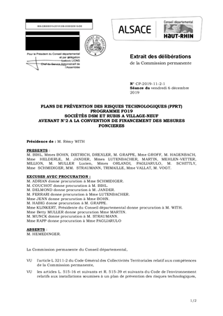 Le présent rapport a pour objet d'approuver l'avenant n°2 à la convention de financement des mesures foncières relatives au PPRT des sociétés DSM Nutritional Product France et Rubis Terminal, implantées à VILLAGE-NEUF. Le coût pour le Département est réduit de 256 495 € à 228 129 €, compte tenu des mesures complémentaires de réduction du risque réalisées par la société DSM, lesquelles ont permis de supprimer le secteur de délaissement De6. Ce rapport a fait l'objet d'un avis favorable de la Commission Aménagement du Territoire et Tourisme réunie le 25 octobre 2019.