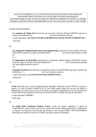 PLANS DE PRÉVENTION DES RISQUES TECHNOLOGIQUES (PPRT)PROGRAMME FO19SOCIÉTÉS DSM ET RUBIS A VILLAGE-NEUFAVENANT N°2 A LA CONVENTION DE FINANCEMENT DES MESURES FONCIERES