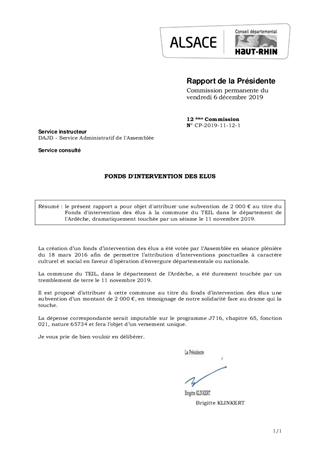 le présent rapport a pour objet d'attribuer une subvention de 2 000 € au titre du Fonds d'intervention des élus à la commune du TEIL dans le département de l'Ardèche, dramatiquement touchée par un séisme le 11 novembre 2019.