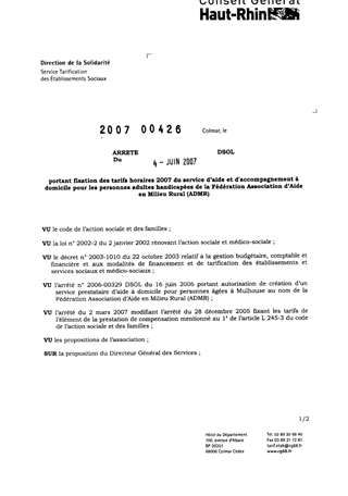 portant fixation des tarifs horaires 2007 du service d'aide et d'accompagnement à domicile pour les personnes adultes handicapées de la Fédération Association d'aide en milieu rural (ADMR). Resumé Pièces jointes ARRETE Assemblée : Non défini Date : 04/06/2007 Rapporteur : Non défini Collectivité : Conseil départemental du Haut-Rhin Direction : Non défini Service : Service de la Tarification des Etablissements Domaine : Autres (non classés) Commission :
