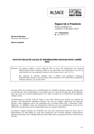 Le présent rapport a pour objet de fixer le taux des impositions du Conseil Départemental pour l’exercice 2020 et, en particulier, de maintenir le taux de la taxe foncière sur les propriétés bâties à son niveau actuel, soit 13,17%. Par ailleurs, le présent rapport vise à définir une politique commune d’exonérations fiscales, dans le cadre de la création de la Collectivité européenne d’Alsace (CeA) au 1er janvier 2021.