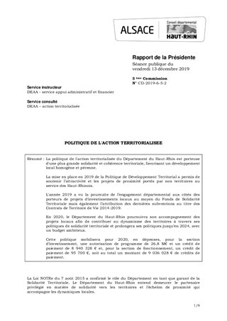La politique de l'action territorialisée du Département du Haut-Rhin est porteuse d'une plus grande solidarité et cohérence territoriale, favorisant un développement local homogène et pérenne. La mise en place en 2019 de la Politique de Développement Territorial a permis de soutenir l’attractivité et les projets de proximité portés par nos territoires au service des Haut-Rhinois. L'année 2019 a vu la poursuite de l’engagement départemental aux côtés des porteurs de projets d’investissements locaux au moyen du Fonds de Solidarité Territoriale mais également l’attribution des dernières subventions au titre des Contrats de Territoire de Vie 2014-2019. En 2020, le Département du Haut-Rhin poursuivra son accompagnement des projets locaux afin de contribuer au dynamisme des territoires à travers ses politiques de solidarité territoriale et prolongera ses politiques jusqu’en 2024, avec un budget ambitieux. Cette politique mobilisera pour 2020, en dépenses, pour la section d’investissement, une autorisation de programme de 26,8 M€ et un crédit de paiement de 8 940 328 € et, pour la section de fonctionnement, un crédit de paiement de 95 700 €, soit au total un montant de 9 036 028 € de crédits de paiement.