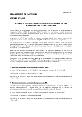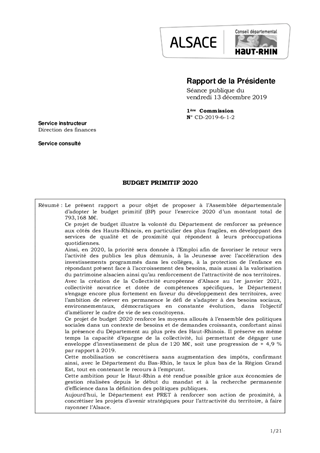 Le présent rapport a pour objet de proposer à l’Assemblée départementale d’adopter le budget primitif (BP) pour l’exercice 2020 d’un montant total de 793,168 M€. Ce projet de budget illustre la volonté du Département de renforcer sa présence aux côtés des Hauts-Rhinois, en particulier des plus fragiles, en développant des services de qualité et de proximité qui répondent à leurs préoccupations quotidiennes. Ainsi, en 2020, la priorité sera donnée à l’Emploi afin de favoriser le retour vers l’activité des publics les plus démunis, à la Jeunesse avec l’accélération des investissements programmés dans les collèges, à la protection de l’enfance en répondant présent face à l’accroissement des besoins, mais aussi à la valorisation du patrimoine alsacien ainsi qu’au renforcement de l’attractivité de nos territoires. Avec la création de la Collectivité européenne d’Alsace au 1er janvier 2021, collectivité novatrice et dotée de compétences spécifiques, le Département s’engage encore plus fortement en faveur du développement des territoires, avec l’ambition de relever en permanence le défi de s’adapter à des besoins sociaux, environnementaux, démocratiques en constante évolution, dans l’objectif d’améliorer le cadre de vie de ses concitoyens. Ce projet de budget 2020 renforce les moyens alloués à l’ensemble des politiques sociales dans un contexte de besoins et de demandes croissants, confortant ainsi la présence du Département au plus près des Haut-Rhinois. Il préserve en même temps la capacité d’épargne de la collectivité, lui permettant de dégager une enveloppe d’investissement de plus de 120 M€, soit une progression de + 4,9 % par rapport à 2019. Cette mobilisation se concrétisera sans augmentation des impôts, confirmant ainsi, avec le Département du Bas-Rhin, le taux le plus bas de la Région Grand Est, tout en contenant le recours à l’emprunt. Cette ambition pour le Haut-Rhin a été rendue possible grâce aux économies de gestion réalisées depuis le début du mandat et à la recherche permanente d’efficience dans la définition des politiques publiques. Aujourd’hui, le Département est PRET à renforcer son action de proximité, à concrétiser les projets d’avenir stratégiques pour l’attractivité du territoire, à faire rayonner l’Alsace.