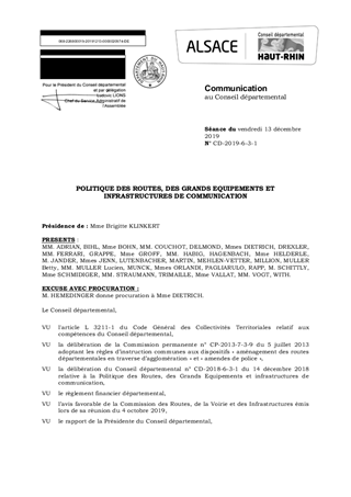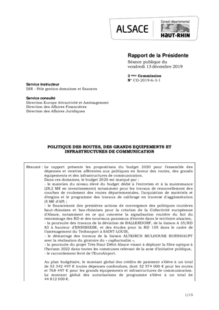 Le rapport présente les propositions du budget 2020 pour l’ensemble des dépenses et recettes afférentes aux politiques en faveur des routes, des grands équipements et des infrastructures de communication. Dans ces domaines, le budget 2020 est marqué par : - le maintien du niveau élevé du budget dédié à l’entretien et à la maintenance (28,2 M€ en investissement) notamment pour les travaux de renouvellement des couches de roulement des routes départementales, l’acquisition de matériels et d’engins et le programme des travaux de calibrage en traverse d'agglomération (5 M€ d'AP) ; - le financement des premières actions de convergence des politiques routières haut-rhinoises et bas-rhinoises pour la création de la Collectivité européenne d’Alsace, notamment en ce qui concerne la signalisation routière du fait du renommage des RD et des nouveaux panneaux d’entrée dans le territoire alsacien, - la poursuite des travaux de la déviation de BALLERDORF, de la liaison A 35/RD 83 à hauteur d’ENSISHEIM, et des études pour la RD 105 dans le cadre de l’aménagement du Technoport à SAINT-LOUIS, - le démarrage des travaux de la liaison ALTKIRCH MULHOUSE BURNHAUPT avec la réalisation du giratoire du « capharnaüm », - la poursuite du projet Très Haut Débit Alsace visant à déployer la fibre optique à l’horizon 2022 dans toutes les communes relevant de la zone d’initiative publique, - le raccordement ferré de l’EuroAirport. Au plan budgétaire, le montant global des crédits de paiement s’élève à un total de 53 342 497 € toutes dépenses confondues, dont 52 574 000 € pour les routes et 768 497 € pour les grands équipements et infrastructures de communication. Le montant global des autorisations de programme s’élève à un total de 44 812 000 €.