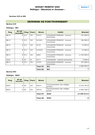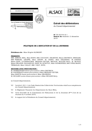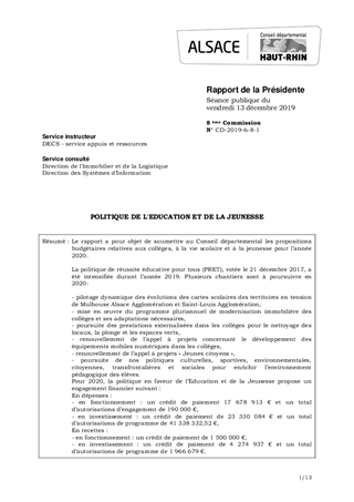 Le rapport a pour objet de soumettre au Conseil départemental les propositions budgétaires relatives aux collèges, à la vie scolaire et à la jeunesse pour l’année 2020. La politique de réussite éducative pour tous (PRET), votée le 21 décembre 2017, a été intensifiée durant l’année 2019. Plusieurs chantiers sont à poursuivre en 2020: - pilotage dynamique des évolutions des cartes scolaires des territoires en tension de Mulhouse Alsace Agglomération et Saint-Louis Agglomération, - mise en œuvre du programme pluriannuel de modernisation immobilière des collèges et ses adaptations nécessaires, - poursuite des prestations externalisées dans les collèges pour le nettoyage des locaux, la plonge et les espaces verts, - renouvellement de l’appel à projets concernant le développement des équipements mobiles numériques dans les collèges, - renouvellement de l’appel à projets « Jeunes citoyens », - poursuite de nos politiques culturelles, sportives, environnementales, citoyennes, transfrontalières et sociales pour enrichir l’environnement pédagogique des élèves. Pour 2020, la politique en faveur de l’Education et de la Jeunesse propose un engagement financier suivant : En dépenses : - en fonctionnement : un crédit de paiement 17 678 913 € et un total d’autorisations d’engagement de 190 000 €, - en investissement : un crédit de paiement de 23 330 084 € et un total d’autorisations de programme de 41 338 332,52 €, En recettes : - en fonctionnement : un crédit de paiement de 1 500 000 €, - en investissement : un crédit de paiement de 4 274 937 € et un total d’autorisations de programme de 1 966 679 €.