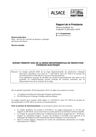 Le budget primitif 2020 de la régie départementale de production d'énergie électrique s'équilibre à un total de 1 220 000 €, dont 271 500 € en section de fonctionnement et 948 500 € en section d'investissement. Il est également proposé de modifier les durées d'amortissement des biens et de procéder au remboursement partiel anticipé de l'avance consentie par le Département lors de la création de la régie.
