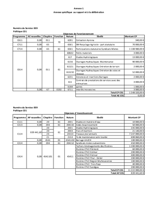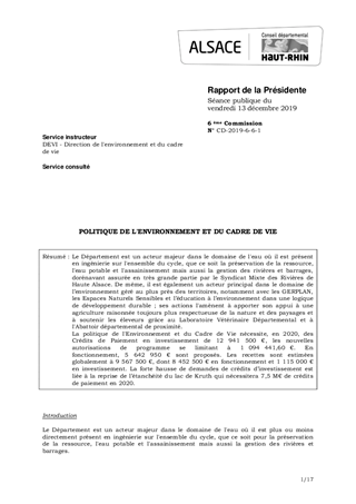 Le Département est un acteur majeur dans le domaine de l'eau où il est présent en ingénierie sur l'ensemble du cycle, que ce soit la préservation de la ressource, l'eau potable et l'assainissement mais aussi la gestion des rivières et barrages, dorénavant assurée en très grande partie par le Syndicat Mixte des Rivières de Haute Alsace. De même, il est également un acteur principal dans le domaine de l’environnement géré au plus près des territoires, notamment avec les GERPLAN, les Espaces Naturels Sensibles et l’éducation à l’environnement dans une logique de développement durable ; ses actions l'amènent à apporter son appui à une agriculture raisonnée toujours plus respectueuse de la nature et des paysages et à soutenir les éleveurs grâce au Laboratoire Vétérinaire Départemental et à l'Abattoir départemental de proximité. La politique de l'Environnement et du Cadre de Vie nécessite, en 2020, des Crédits de Paiement en investissement de 12 941 500 €, les nouvelles autorisations de programme se limitant à 1 094 441,60 €. En fonctionnement, 5 642 950 € sont proposés. Les recettes sont estimées globalement à 9 567 500 €, dont 8 452 500 € en fonctionnement et 1 115 000 € en investissement. La forte hausse de demandes de crédits d’investissement est liée à la reprise de l’étanchéité du lac de Kruth qui nécessitera 7,5 M€ de crédits de paiement en 2020.