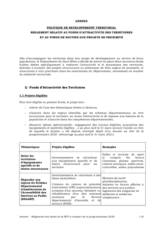 La Politique de Développement territorial constitue un véritable levier en faveur de l’attractivité et de la proximité au bénéfice des haut-rhinois. Afin de l’adapter plus finement aux problématiques des territoires, des modifications au règlement de cette politique sont proposées dans le présent rapport. Ce rapport a fait l’objet d’un avis favorable lors de la réunion de la Commission Patrimoine Immobilier, Actions et Territoires en date du 22 novembre 2019.