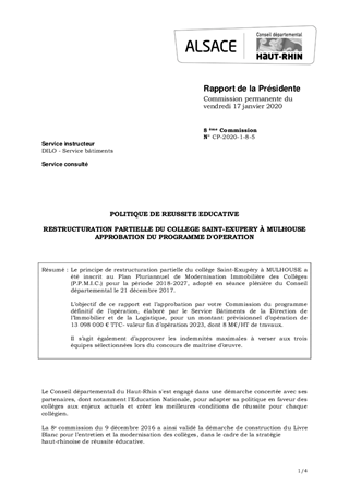 POLITIQUE DE REUSSITE EDUCATIVE RESTRUCTURATION PARTIELLE DU COLLEGE SAINT-EXUPERY À MULHOUSE APPROBATION DU PROGRAMME D'OPERATION
