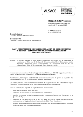 Le présent rapport a pour objet d'approuver les termes de la convention à conclure avec l'Etat afin de désigner le Département du Haut-Rhin comme maître d'ouvrage temporaire pour l'aménagement de l'autoroute A35 et de ses échangeurs n° 36 et 37 prévu dans le cadre du projet 5A3F.