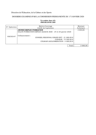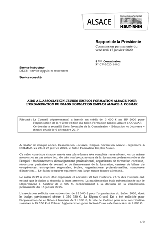 Le Conseil départemental a inscrit un crédit de 3 000 € au BP 2020 pour l’organisation de la 42ème édition du Salon Formation Emploi Alsace à COLMAR. Ce dossier a recueilli l’avis favorable de la Commission « Education et Jeunesse » (8ème) réunie le 6 décembre 2019