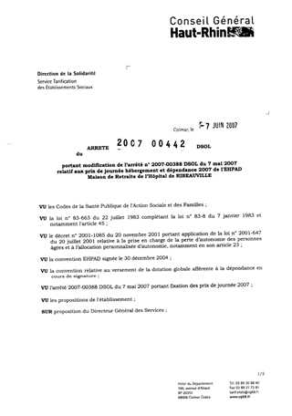 portant modification de l'arrêté n° 2007-00388-DSOL du 7 mai 2007 relatif aux prix de journée hébergement et dépendance 2007 de l'EHPAD maison de retraite de l'hôpital de RIBEAUVILLE. Resumé Pièces jointes ARRETE Assemblée : Non défini Date : 07/06/2007 Rapporteur : Non défini Collectivité : Conseil départemental du Haut-Rhin Direction : Non défini Service : Service de la Tarification des Etablissements Domaine : Prix de Journée Commission :