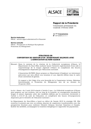 Dans le contexte de la création de la Collectivité européenne d’Alsace, le Département du Haut-Rhin souhaite lancer l’initiative expérimentale d’une aide à l’apprentissage de la langue régionale d’Alsace en complément des heures d’enseignement dispensées par l’Education nationale. L’Association ELTERN Alsace propose au Département d’employer un intervenant précurseur qui sera affecté aux missions et aux objectifs définis dans le cadre d’une convention de gestion. Ce rapport a fait l’objet d’un avis favorable de la Commission Actions, Relations Internationales et Promotion du Bilinguisme lors de sa réunion du 24 janvier 2020.