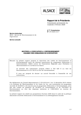 Le présent rapport propose la répartition des crédits de fonctionnement et d’investissement entre les diverses associations du programme d’éducation à l’environnement, fédéré autour de l’Association Régionale pour l’Initiation à l’Environnement et à la Nature en Alsace. Le montant des subventions proposé s’élève à 763 620 € au titre du fonctionnement et à 22 762 € au titre de l’investissement. Il vous est proposé de donner un accord favorable à l’ensemble de ces subventions.