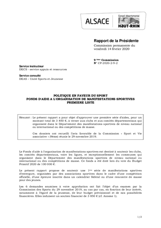 Le présent rapport a pour objet d’approuver une première série d’aides, pour un montant total de 3 850 €, à verser aux clubs et aux comités départementaux qui organisent dans le Département des manifestations sportives de niveau national ou international ou des compétitions de masse. Ces dossiers ont recueilli l’avis favorable de la Commission « Sport et Vie associative » (9ème) réunie le 29 novembre 2019.