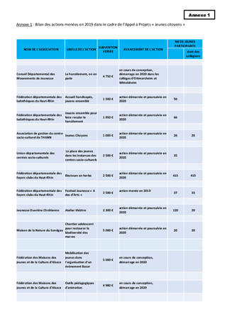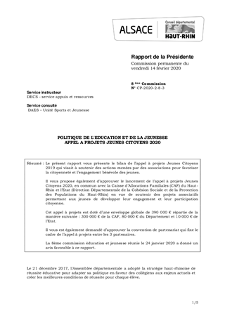 Le présent rapport vous présente le bilan de l’appel à projets Jeunes Citoyens 2019 qui visait à soutenir des actions menées par des associations pour favoriser la citoyenneté et l’engagement bénévole des jeunes. Il vous propose également d’approuver le lancement de l’appel à projets Jeunes Citoyens 2020, en commun avec la Caisse d’Allocations Familiales (CAF) du Haut-Rhin et l’Etat (Direction Départementale de la Cohésion Sociale et de la Protection des Populations du Haut-Rhin) en vue de soutenir des projets associatifs permettant aux jeunes de développer leur engagement et leur participation citoyenne. Cet appel à projets est doté d’une enveloppe globale de 390 000 € répartie de la manière suivante : 300 000 € de la CAF, 80 000 € du Département et 10 000 € de l’Etat. Il vous est également demandé d’approuver la convention de partenariat qui fixe le cadre de l’appel à projets entre les 3 partenaires. La 8ème commission éducation et jeunesse réunie le 24 janvier 2020 a donné un avis favorable à ce rapport.
