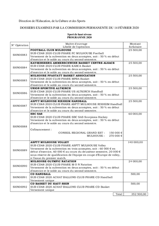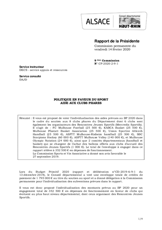 Il vous est proposé de voter l'individualisation des aides prévues au BP 2020 dans le cadre du soutien aux 8 clubs phares du Département dont 6 clubs sont également les organisateurs des Rencontres Jeunes Sportifs (Mercredis Sportifs). Il s’agit de : FC Mulhouse Football (25 500 €), KABCA Basket (25 500 €), Mulhouse Pfastatt Basket Association (25 500 €), Union Sportive Altkirch Handball (25 500 €), ASPTT Mulhouse-Rixheim handball (25 500 €), SBC Scorpions Hockey (60 000 €), ASPTT Mulhouse Volley (140 000 €), et Mulhouse Olympic Natation (24 000 €), ainsi que 2 comités départementaux (handball et basket) qui se chargent de l’achat des ballons offerts aux clubs d’accueil des Rencontres Jeunes Sportifs (1 000 €). Le total de l'enveloppe à engager dans ce rapport s'élève à 352 500 € en dépenses de fonctionnement. La Commission Sports et Vie Associative a donné son avis favorable le 27 septembre 2019.